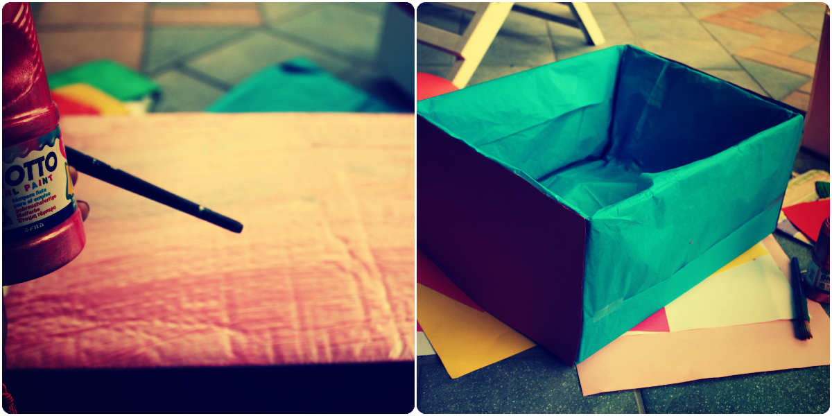 I painted the first box with pearly pink tempera, making a thick coating in order to cover the original box well. otherwise I covered the second box with light blue tissue paper and purple thin cardboard.