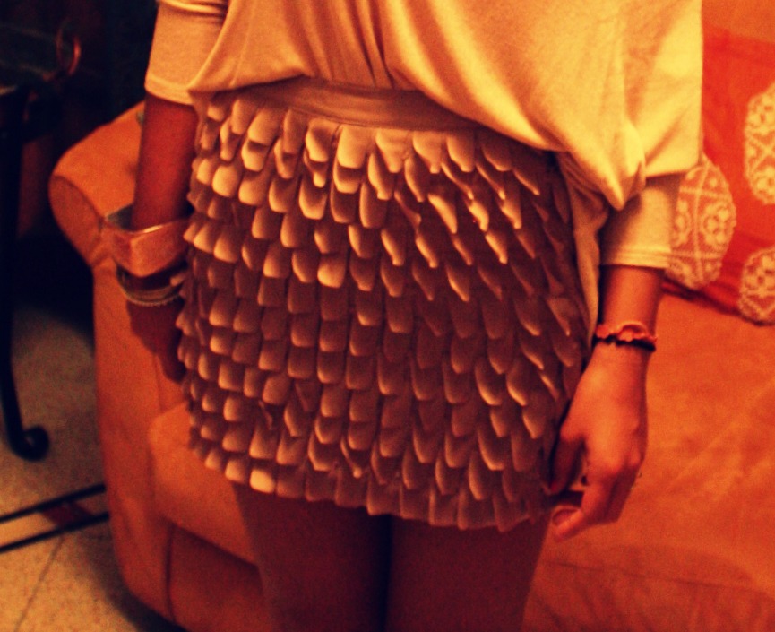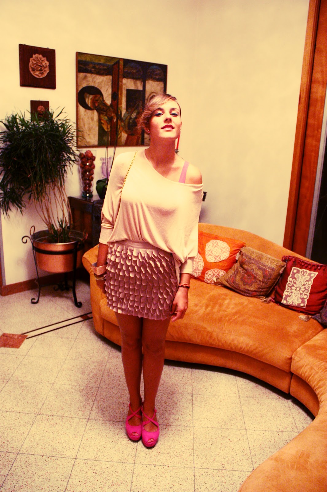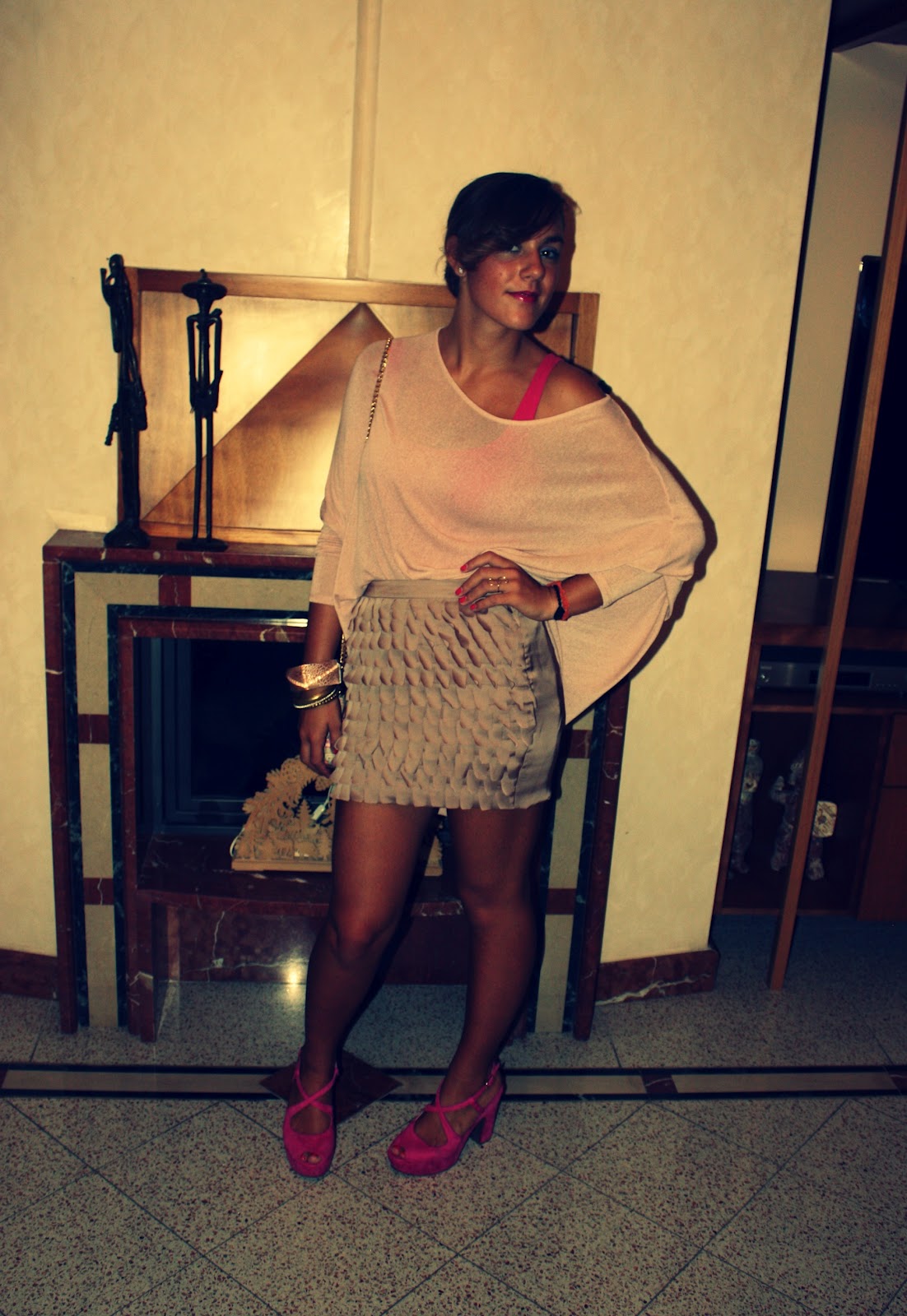 Questo è uno dei miei ultimi outfit. Ho indossato un completo reso abbastanza elegante da una gonna color sabbia con rouches. Direi che per i colori che ho scelto questo completo è indossabile sia per qualche occasione mattutina, sia per qualche serata impegnativa. Lo gonna (che ho comprato da Silvian Heach) l’ho sdrammatizzata con un largo maglioncino di cotone color rosa confetto. Il tutto con particolari fuxia : canotta (H&M) scarpe e smalto.