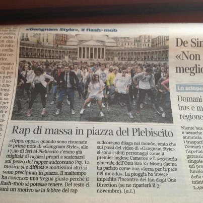 Yesterday, October 27th, a group of youngmen organized a flashmod in Neaples to challenge Milan, Paris, Palermo. They chose the South Corean PSY‘s “Gangnam Style” as theme for their Fashmob. Besides the organizers put a video with the coreography on youtube in order to make everything perfect.
