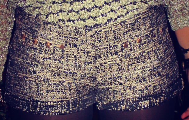 Whit a pair of black and gold pair of shorts and semi-opaque black stocking.
