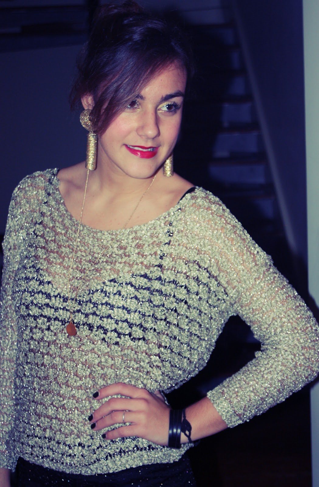Infatti ho indossato un maglioncino dorato, con una mini nera con applicazioni in oro, orecchini in corda dorati, calze e scarpe nere.