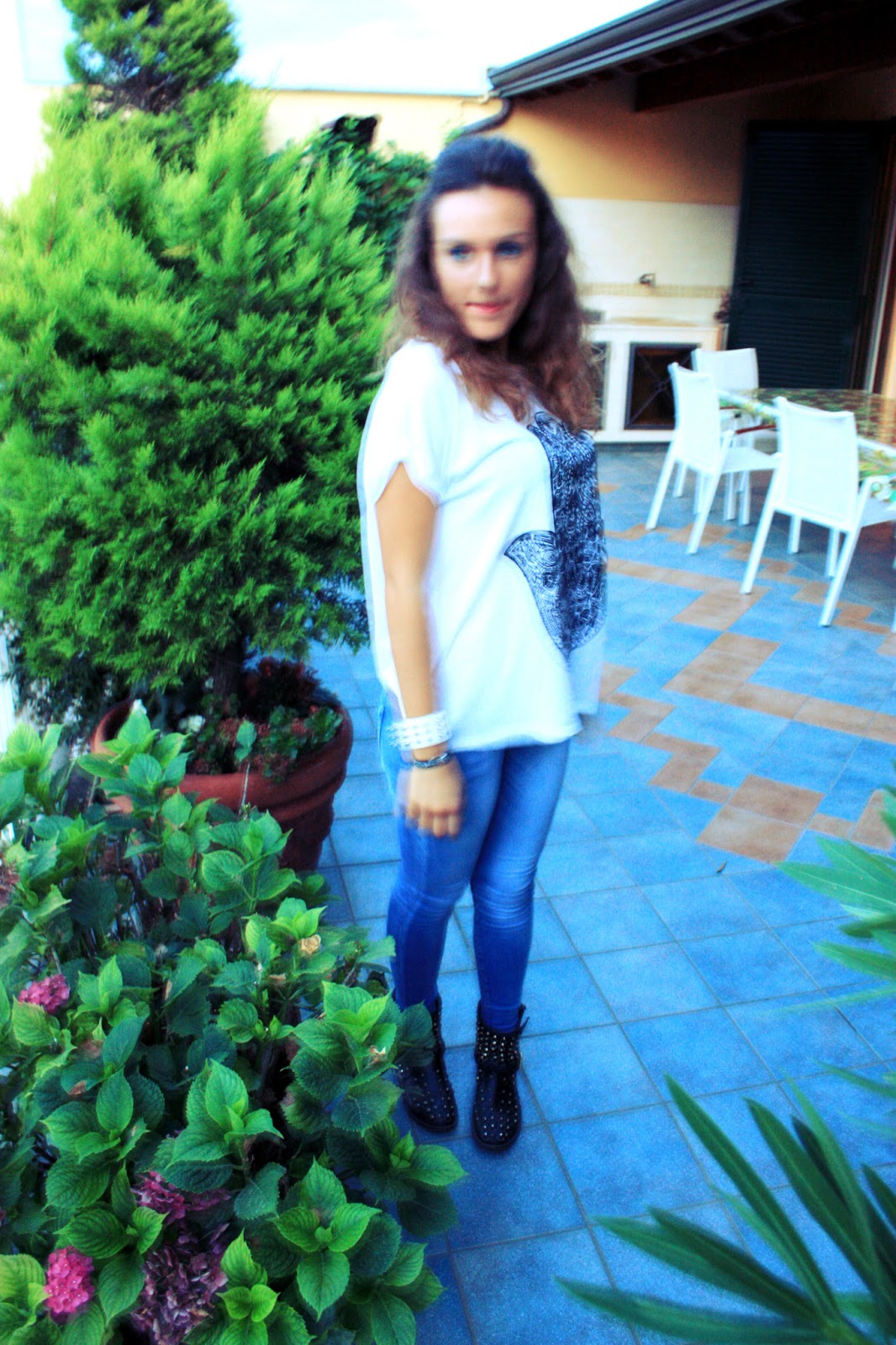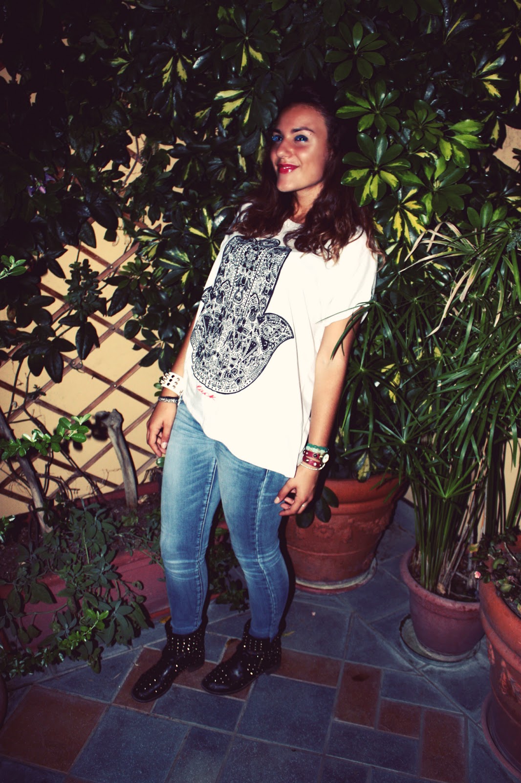 It was a long time since it rained in July last time; lust summer in this period I was armored at home with air conditioning because of the too warm weathwe. This year, instead, rain is the perfect and sweetest companion of my summer and for this reason it’s possible to wear jeans for a punk night. Last night I had to take part in a family dinner and I got bored of dressing up, so I wore a simple pair of skinny jeans, matched with a pair of studded black boots and a large t-shirt with the “Turkish hand”http://it.wikipedia.org/wiki/Mano_di_Fatima.